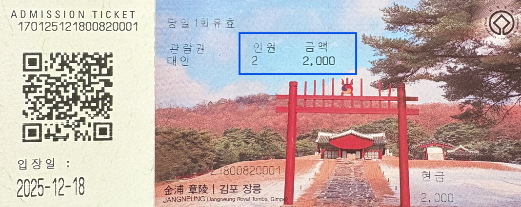 왕릉은 격이 달라서 '국가유산청 조선왕릉서부지구관리소'에서 관리합니다. 입장료 ₩1,000/인 입니다.