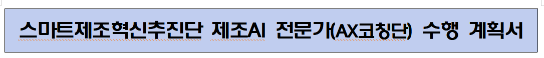 | 사업목적 | AX 기획지원을 신청한 수요기업 현장에 2인 1팀 (AI전문가 1인, 공정 전문가 1인)으로 방문하여 제조 AI 기반 스마트공장 도입을 위한 전략 수립 및 노하우 전수 |